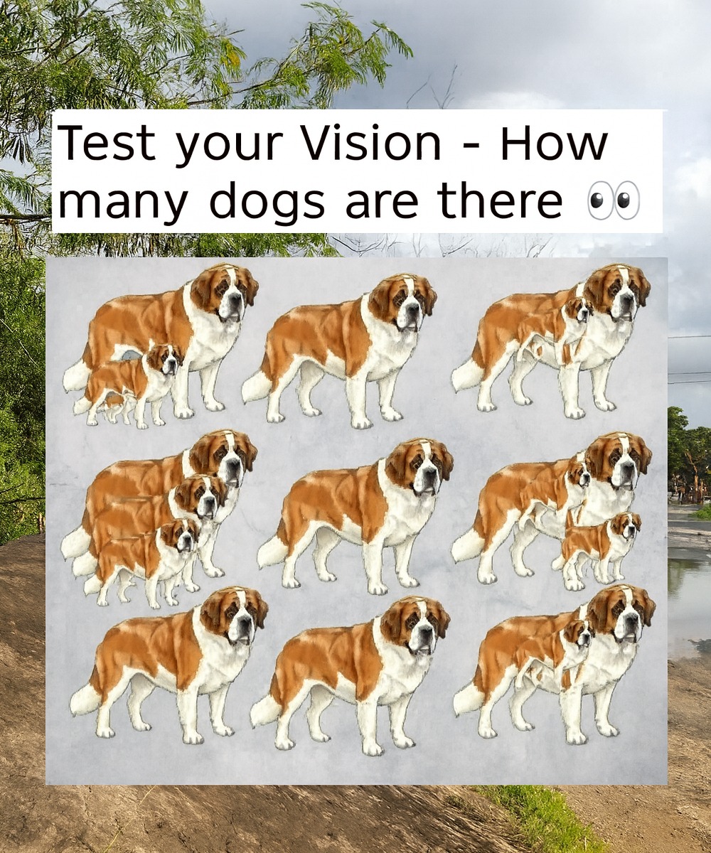 At first glance, this picture looks like a simple lineup of St. Bernards — nine, maybe? Most people stop counting there and move on, convinced they’ve got it right. But this image hides a clever trick.